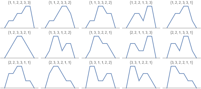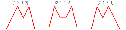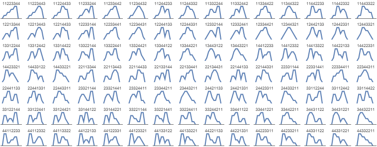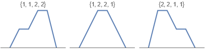 One way to visualize Stirling permutations is as a simple list plot. The \((2\times 2 - 1)!! = 3!! = 3\) Stirling permutations of {1,1,2,2}: