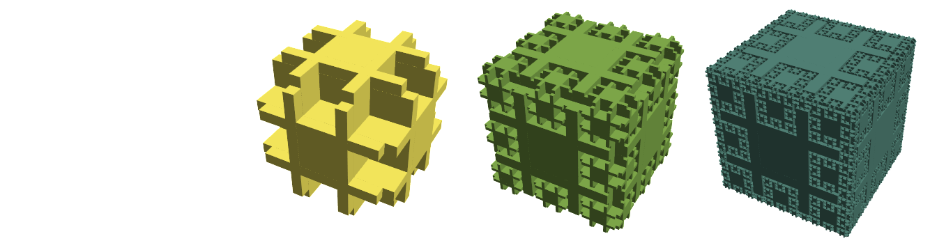 The Cross Menger/Jerusalem cube is different from similar-looking fractals such as the Menger sponge in that the ratio between each iteration’s components is an irrational number, (√2 − 1). The Menger sponge pieces, on the other hand, have a (rational) middle ninth punched out each time. Remember when we thought that was cool?