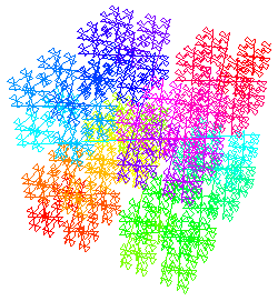 Each subsequent iteration is created by copying the entire figure to each corner of the cube, and then connecting the last point of each copy of the figure to the first point of the next copy. The last figure has exaggerated translations between iterations and a crazy color scheme to try to show how it’s put together.