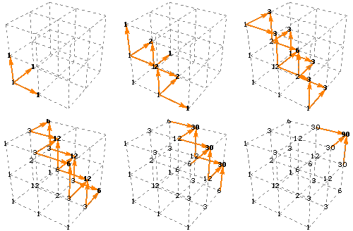 Here are some diagrams that represent the possible paths of length 3n from one corner of an n-by-n-by-n lattice to the opposite corner. The number of paths can be calculated using the formula: